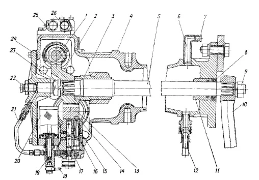 Гидроусилитель рулевого управления трактора МТЗ-80 (МТЗ-82): 1 — червяк; 2 — сектор; 3 — верхняя втулка; 4 — корпус; 5 — поворотный вал; в — спускной патрубок; 7 — сливная пробка; 8 — манжета; 9 — гайка сошки; 10 — сошка; 11 — нижняя втулка; 12 — всасывающий трубопровод; 13 — рейка; 14 — упор рейки; 15 — золотник датчика блокировки дифференциала; 16 — регулировочные прокладки; 17 — поворотный кран датчика блокировки дифференциала; 18 — трубопровод клапана; 19 — корпус клапана; 20 — сливной фильтр; 21 — подводящий трубопровод; 22 — регулировочный болт; 23 — гайка; 21 — верхняя крышка; 25 — пробка; 26 — колпачок предохранительного клапана.