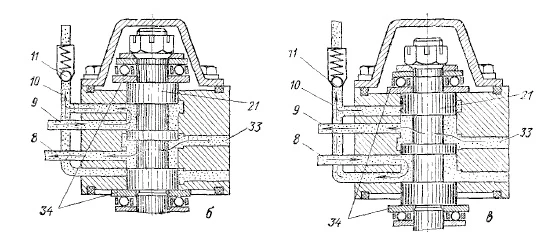 Схема гидроусилителя рулевого управления трактора MT3-80 (МТЗ-82): а — нейтральное положение; б — поворот вправо; в — поворот влево; 1 — корпус гидроусилителя; 2 — задняя крышка цилиндра; 3 — поршень; 4 — шток; 5 — передняя крышка цилиндра; 6 — трубопровод клапана блокировки; 7 — упорный подшипник; 8, 9 к 10 — трубопроводы; 11 — редукционный клапан; 12 — крышка корпуса; 13 — сферическая гайка; 14 — шайба; 15 и 16 — пружина золотника; 17 — корпус распределителя; 18 — ползуны; 19 — клапанная коробка; 20 — направляющая предохранительного клапана; 21 — золотник распределителя; 22 — червяк; 23 — регулировочная втулка; 24 — сошка; 25 — поворотный вал; 26 — сектор; 27 — золотник датчика блокировки; 28 — трубопровод датчика; 29 — регулировочные прокладки; 30 — упор рейки; 31 — рейка; 32 — палец; 33 — трубопровод от насоса к распределителю; 34 — шайбы (кольца) подшипников.