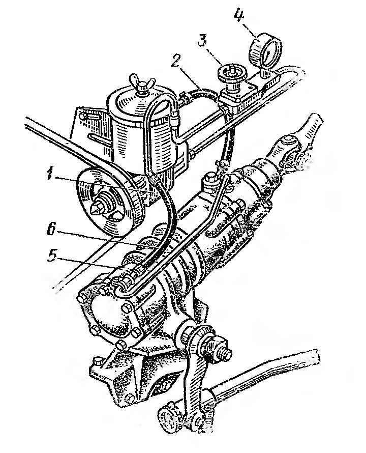1 — насос гидроусилителя; 2 — шланг низ­кого давления; 3 — вентиль; 4 — нано­метр; 5 — рулевой механизм; 6 — шланг высокого давления.