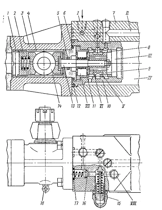 Для ограничения давления масла в нагнетательной магистрали системы и предохранения элементов системы от разрушения в цилиндре установлен предохранительный клапан, отрегулированный на максимальное давление в магистрали 85 кГ/см2; при повышении давления в системе гидроусилителя до величины, ограничиваемой клапаном, клапан-конус перемещается вниз (по рисунку) и нагнетательный канал I сообщается со сливным каналом VIII.
