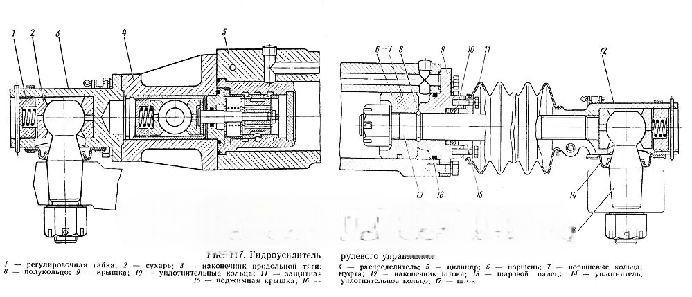 Гидроусилитель руля самосвалов Белаз-540, Белаз-540А, Белаз-548А (рис. 117) состоит из силового цилиндра с поршнем и штоком и золотникового распределителя. На штоке закреплен шаровой шарнир, через который гидроусилитель крепится к раме автомобиля. Другим шарниром, прикрепленным к корпусу распределителя, гидроусилитель соединяется с продольной тягой. К переднему торцу цилиндра крепится распределитель 4.