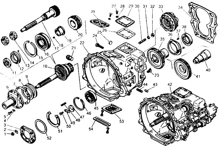 | 19 | Втулка заднего подшипника первичного вала | 46 | Кольцо упорное переднего подшипника |