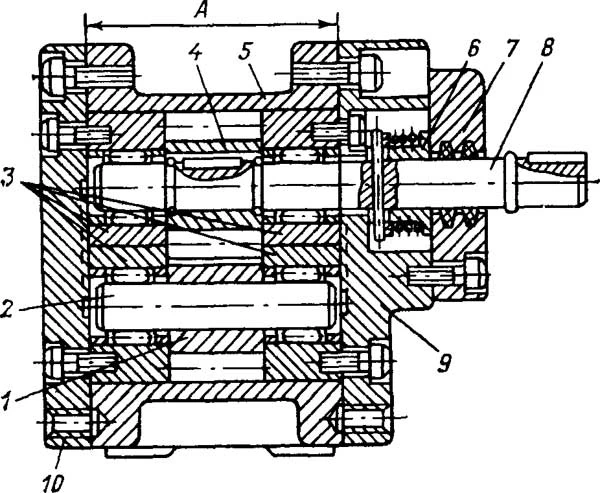 При разборке насоса после длительной его эксплуатации обычно обнаруживается износ корпуса 5 в зоне шестерен 1 и 4 по всей поверхности валиков 2 и 8 и опорных втулок 3. Фланцы насоса 9 и 10 износу практически не подвергаются. Особенно сильно изнашиваются соприкасающиеся торцы шестерен и опорных втулок, на поверхностях которых образуются кольцевые задиры, волнистость и др.